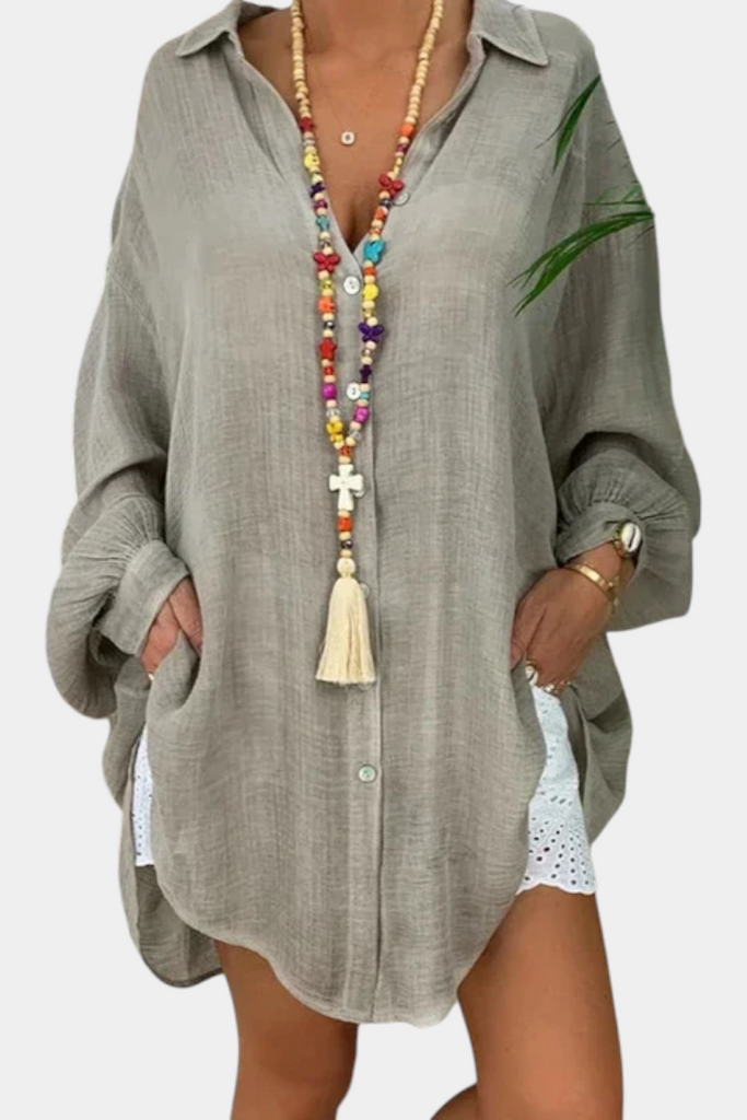 La Camisa Oversized Melis es la adición perfecta a tu guardarropa de verano. Hecha de algodón ligero, también puede usarse como vestido de playa y cubre traje de baño. Su corte holgado es cómodo y elegante, lo que la convierte en la elección ideal para un día en la playa. Mantente fresco y elegante con la Camisa Oversized Melis.