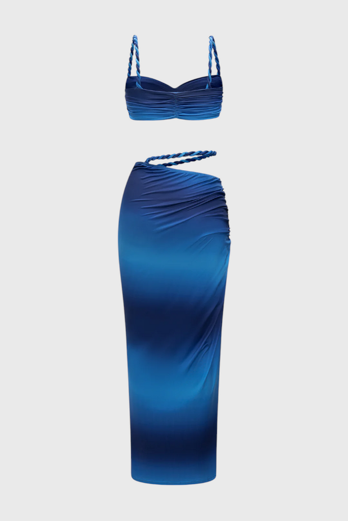 Vibrante y llamativo, este conjunto de falda está diseñado para destacar con su suave chiffon plisado, delicada bordado y soñados tonos en degradado. Ofrece una sensación ligera y aireada que se mueve maravillosamente contigo. Perfecto para salidas de primavera, vacaciones o eventos bajo el sol.