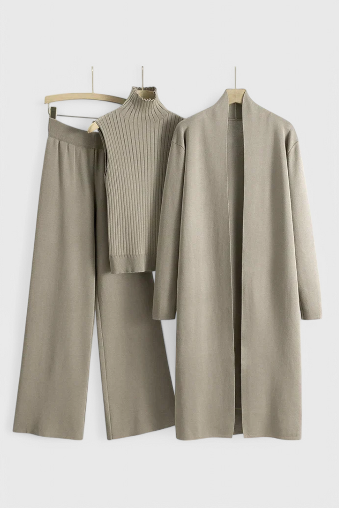 Donde la elegancia atemporal se encuentra con la comodidad diaria. El conjunto de 3 piezas Mahalia presenta un cárdigan largo, un cuello de tortuga sin mangas y pantalones de pierna ancha, todos elaborados con un tejido de punto ultra suave y transpirable. Ya sea que estés relajándote en casa, yendo a un brunch o saliendo por la noche, este conjunto ofrece una sofisticación sin esfuerzo con la comodidad que te encantará.