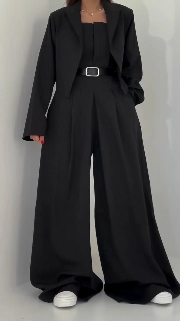 Sofisticación y encanto contemporáneo en perfecta armonía. Con un mono de piernas ultra-anchas, bustier estructurado y chaqueta fluida a juego, está diseñado para favorecer todas las siluetas. El cinturón ajustable define la cintura, mientras que su corte fluido asegura comodidad y elegancia en cualquier ocasión – desde la oficina hasta tus noches especiales.