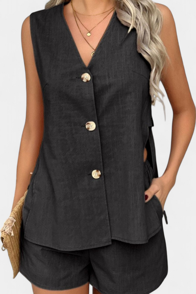 - Camisa sin mangas con escote en V y botones para un look estructurado y limpio