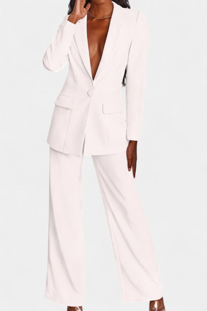 - Blazer de un solo botón con escote en V profundo y hombros definidos