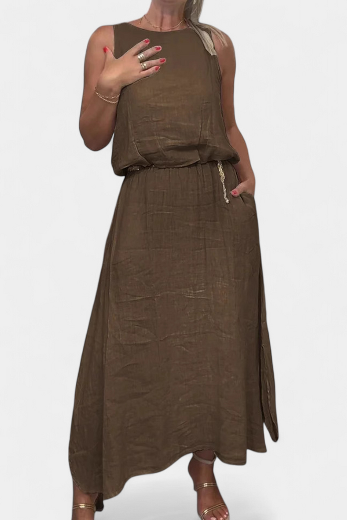 Natural, fresco y minimalista. El conjunto Meliora combina lo esencial del verano con un corte relajado y sofisticado. Compuesto por un chaleco sin mangas de caída suelta y una falda larga con bolsillos laterales, está elaborado en una mezcla de lino y algodón que respira elegancia con cada movimiento.