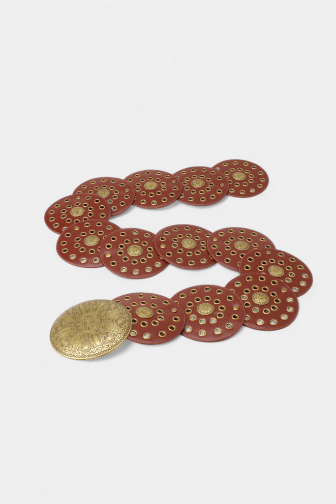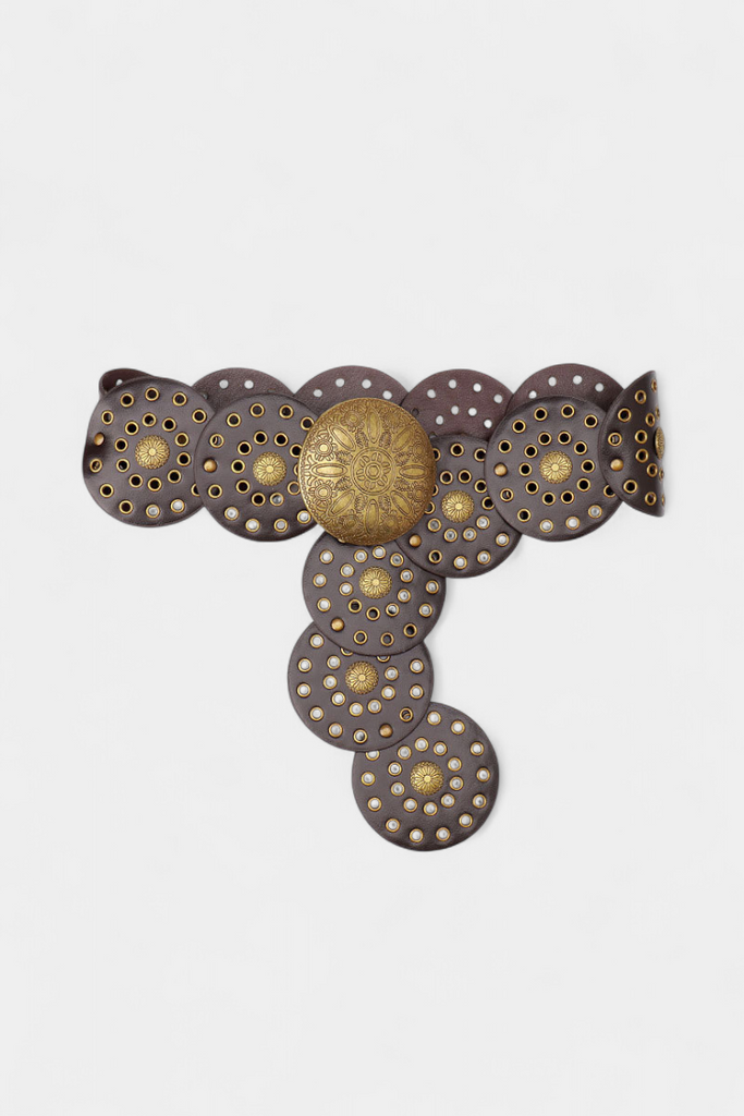Un accesorio audaz que combina el estilo western con un aire bohemio y original. El cinturón Alicia destaca por su diseño circular troquelado con una gran hebilla metálica central, perfecto para elevar cualquier conjunto con carácter y personalidad. Ideal para llevar sobre vestidos, faldas o prendas fluidas, aporta una silueta marcada con un toque retro inconfundible.
