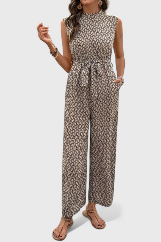 Confiada y sin esfuerzo, Carmela aporta un giro audaz al vestuario de verano. Con un llamativo estampado geométrico, este mono sin mangas está confeccionado en una mezcla de algodón transpirable que se mueve contigo. La cintura con lazo favorecedora y la silueta de pierna ancha crean un look relajado pero refinado, perfecto para paseos al sol, brunchs elegantes o reuniones casuales por la tarde.
