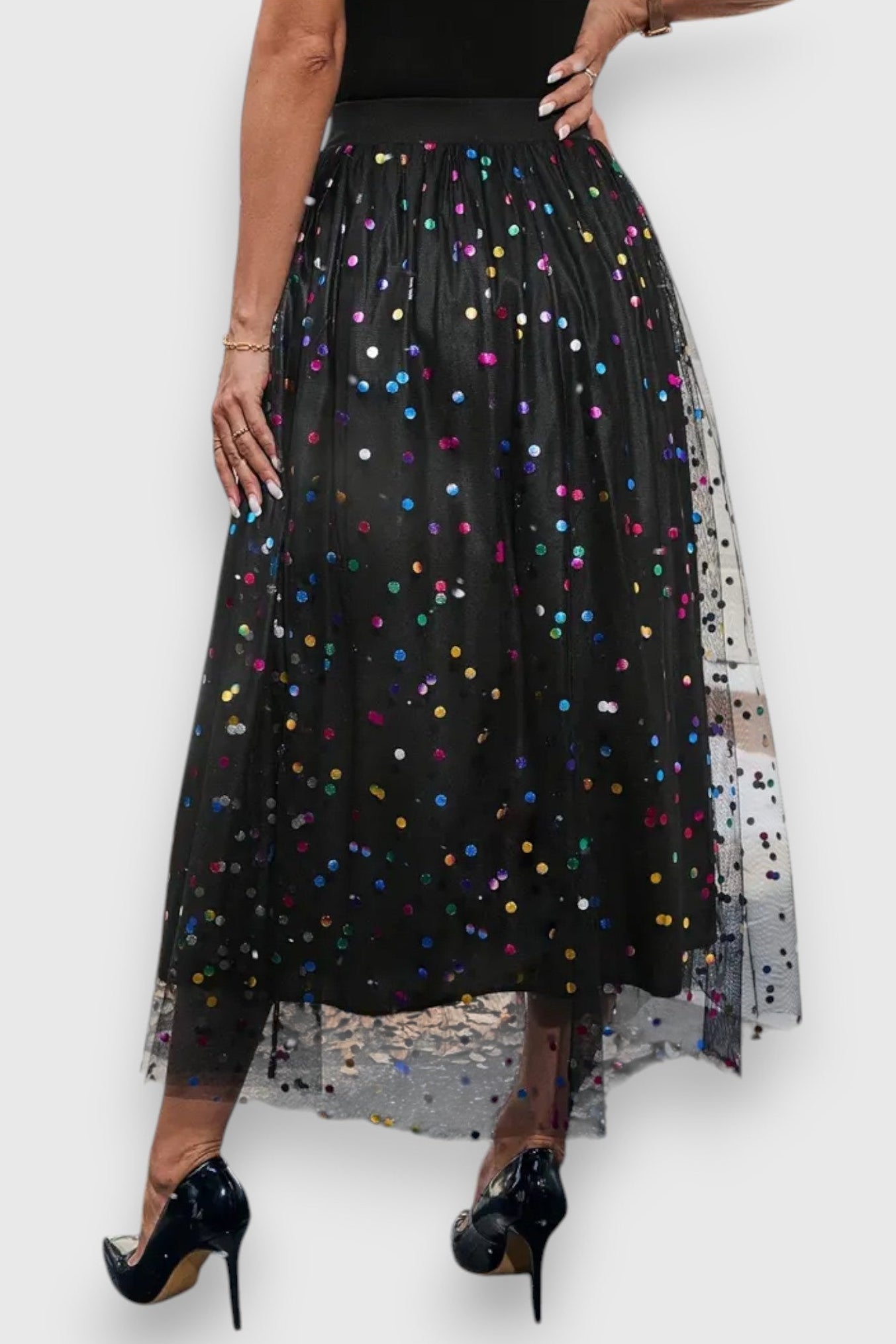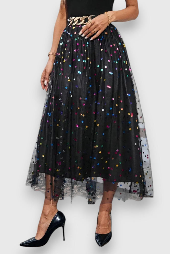 Falda elegante y larga con un divertido patrón de lunares y un diseño de malla fluido. Perfecta para atuendos elegantes en cualquier temporada.