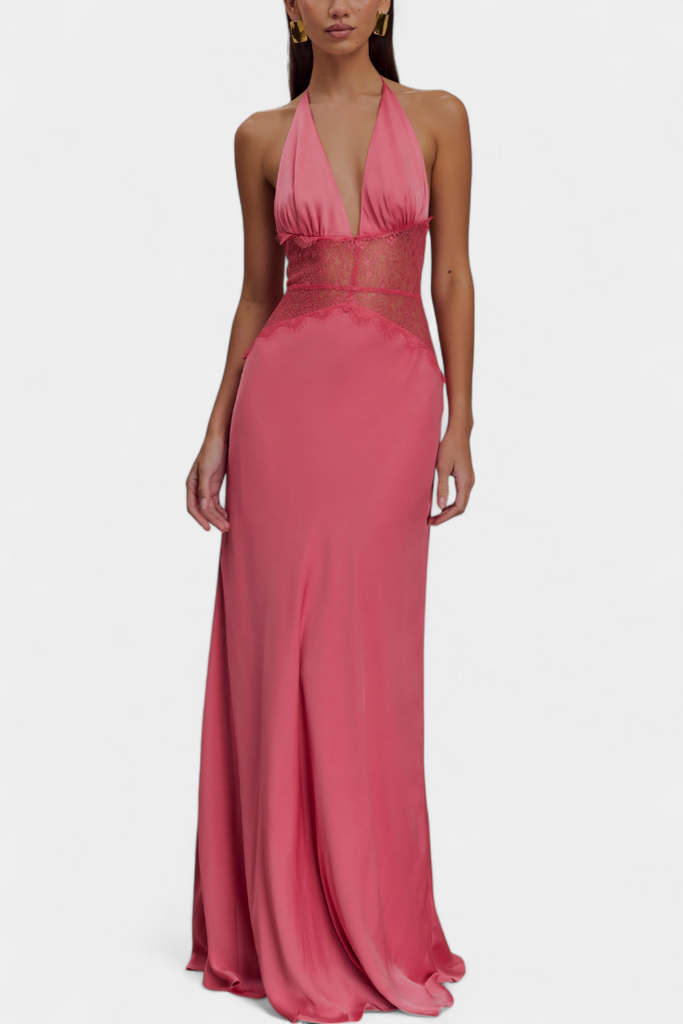 Ashanty Vestido Largo con Escote Halter y Cintura de Encaje Transparente