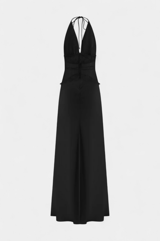 Un diseño que irradia sensualidad refinada y elegancia sofisticada. Ashanty combina un escote halter pronunciado con una delicada franja de encaje en la cintura, creando un contraste perfecto entre lo sutil y lo audaz. El tejido fluido envuelve el cuerpo con gracia, mientras que la espalda completamente descubierta añade un giro inesperado y atrevido.