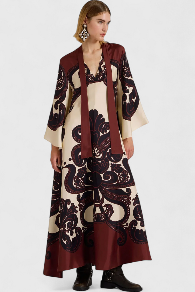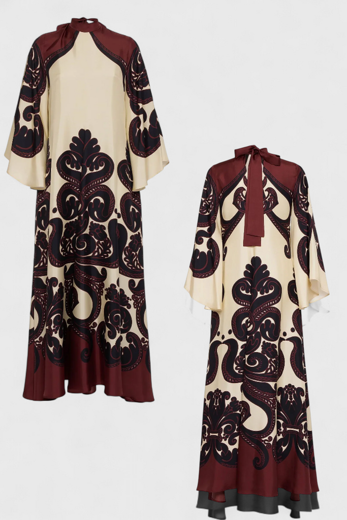 Fluidez artística con un diseño que impone elegancia. El vestido Maritza destaca por su silueta envolvente, cuello alto con cinta posterior y un delicado estampado de grenadilla, creando una estética sofisticada y segura. Ideal para momentos en los que el estilo se convierte en protagonista.