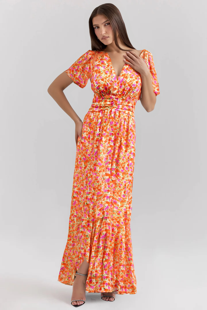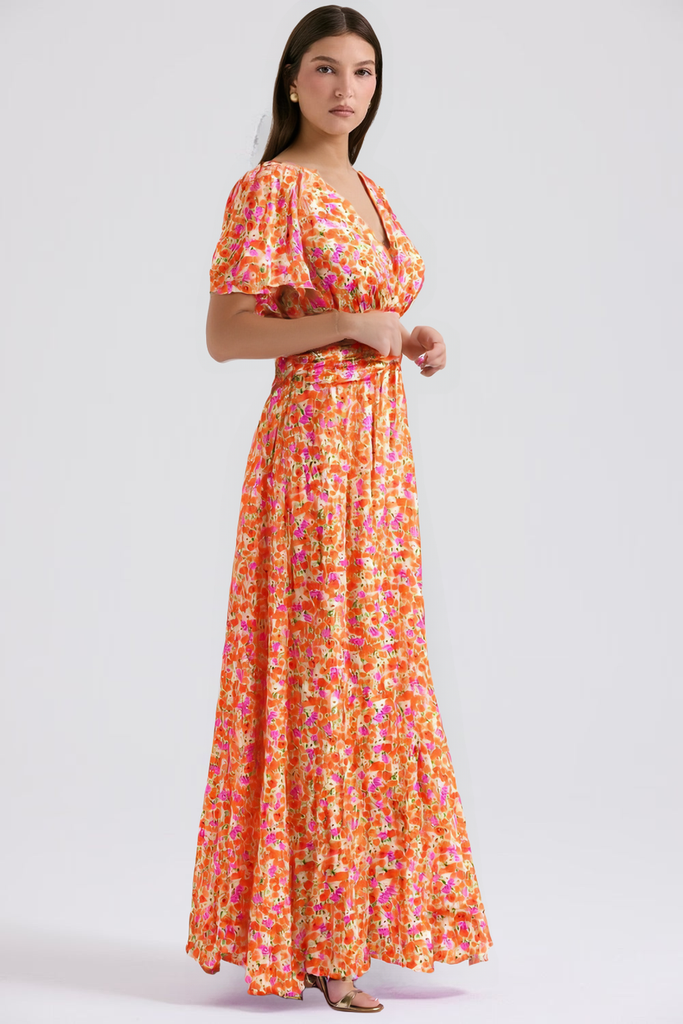 Su estampado floral vibrante evoca la frescura de los días soleados, mientras que su corte favorecedor realza la silueta con naturalidad y elegancia.