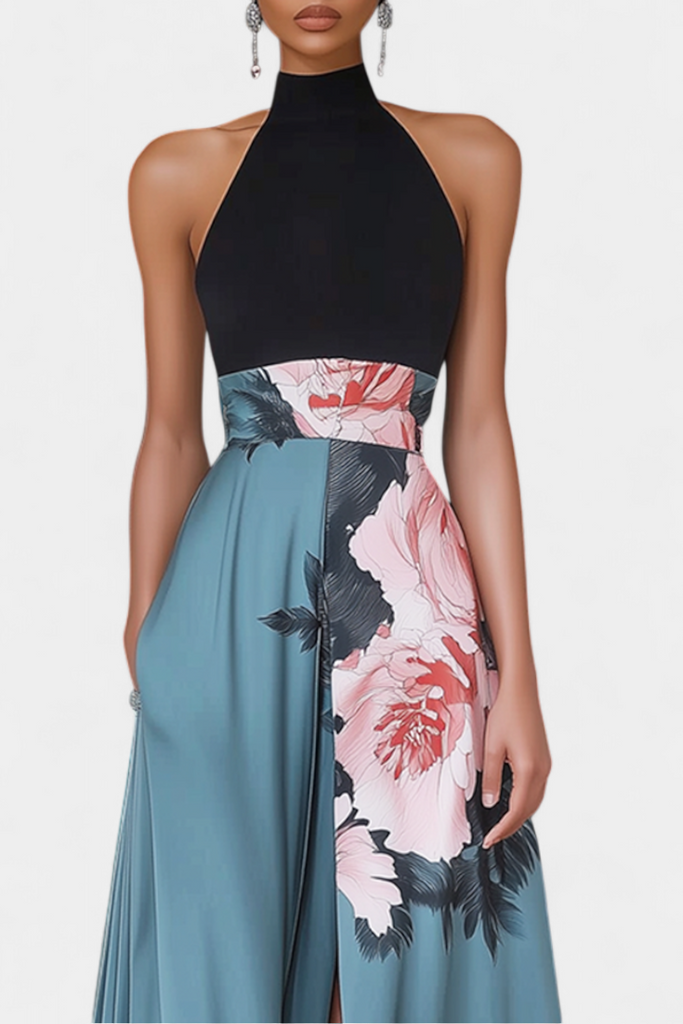 Radmila Vestido A-Line con Cuerpo Negro y Falda Floral en Contraste