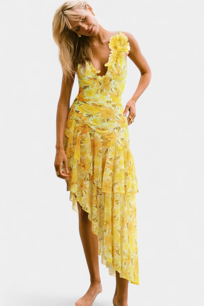 - Estampado de lirios amarillos que evoca un aire veraniego y alegre