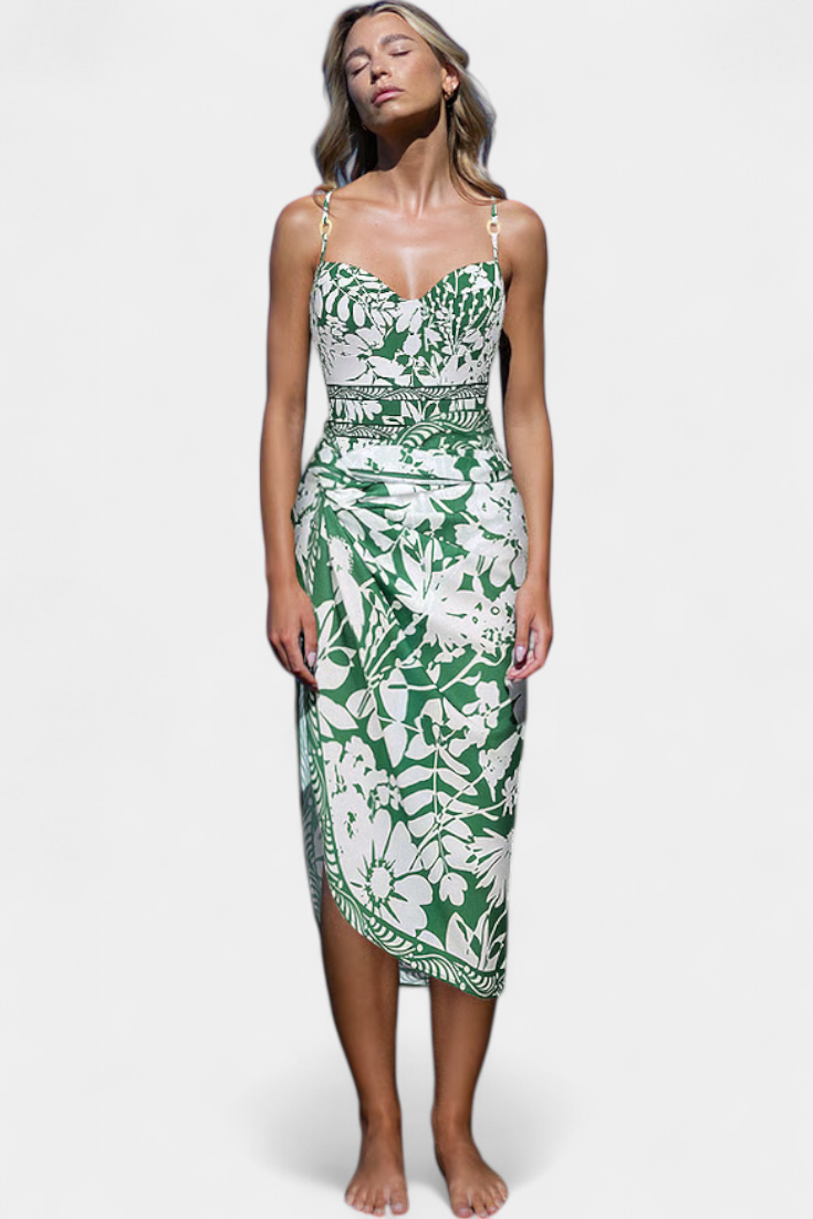 Inspirado en la calma de la naturaleza, el conjunto Ahria combina un bañador de una sola pieza con un vestido de tirantes estampado, ideal para quienes buscan comodidad sin renunciar al estilo. Su diseño fluido y el estampado de sombras de árboles crean un efecto visual suave y envolvente.