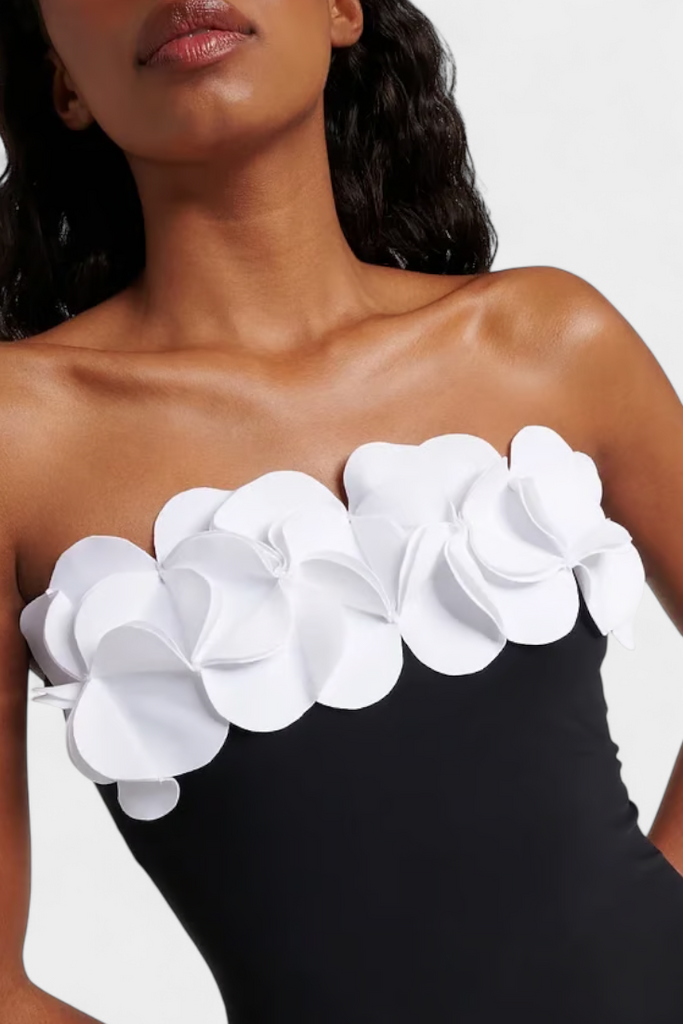 Sensual, romántico y lleno de encanto veraniego. El conjunto Ahria combina un bañador asimétrico con flores tridimensionales en relieve y una falda pareo envolvente a juego, creando un look que destaca por su delicadeza y originalidad.