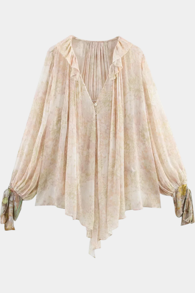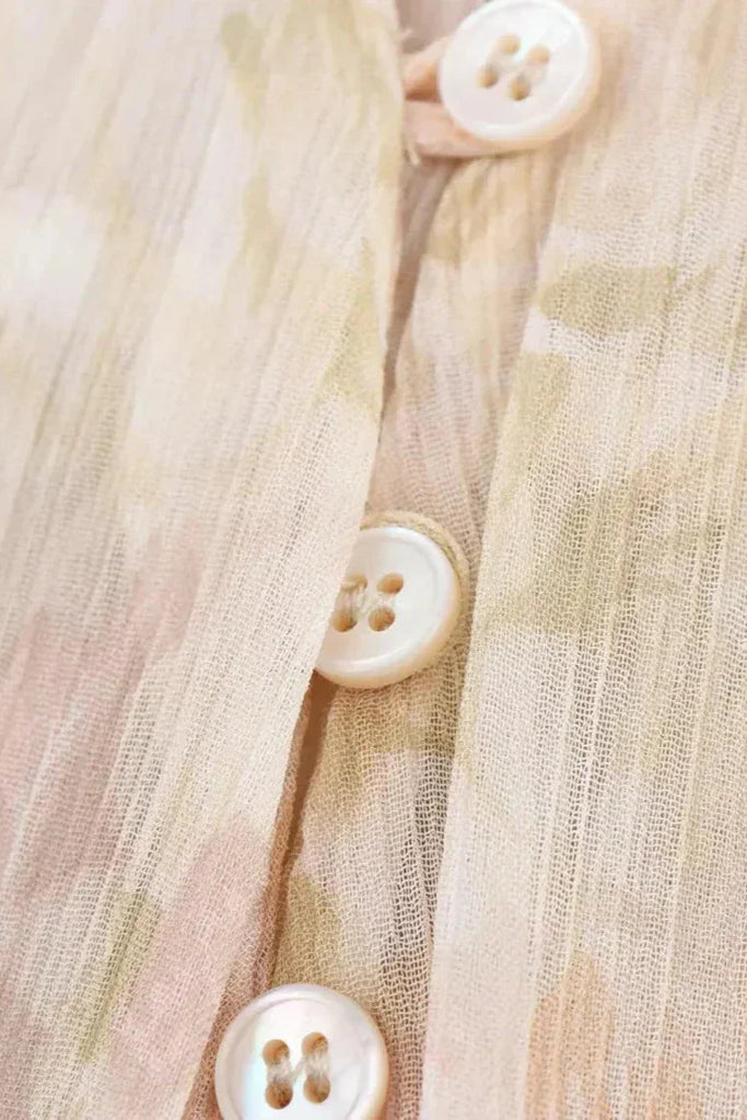 Déjate llevar por la brisa con la Blusa Dunas Susurrantes. Con un estampado de tonos pastel de ensueño, mangas con lazo romántico y delicados botones de nácar, esta prenda ligera es perfecta para aventuras bañadas por el sol y días despreocupados.